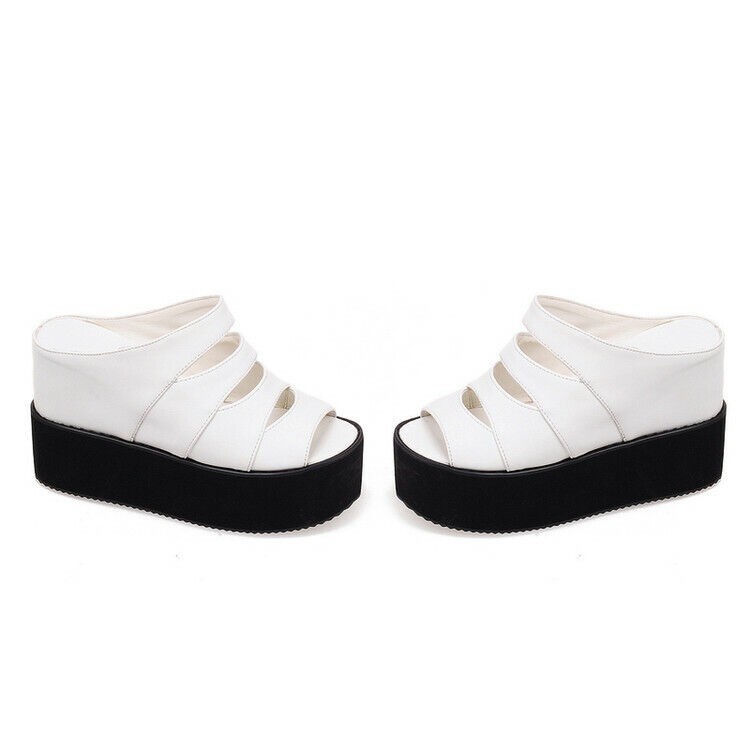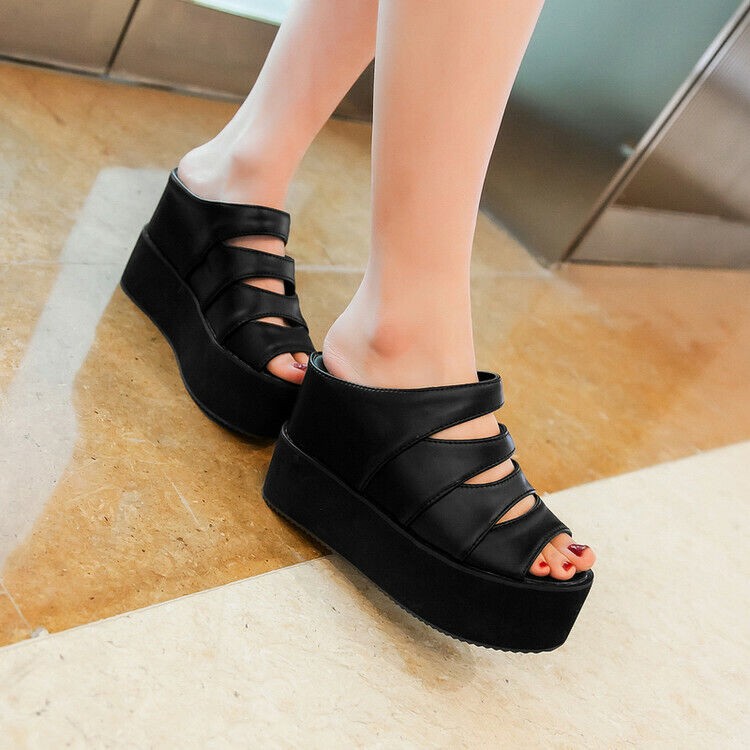 Womens Wedge Heel Black Slip on Shoes Summer Sandals Platform Open Toe Plus Size